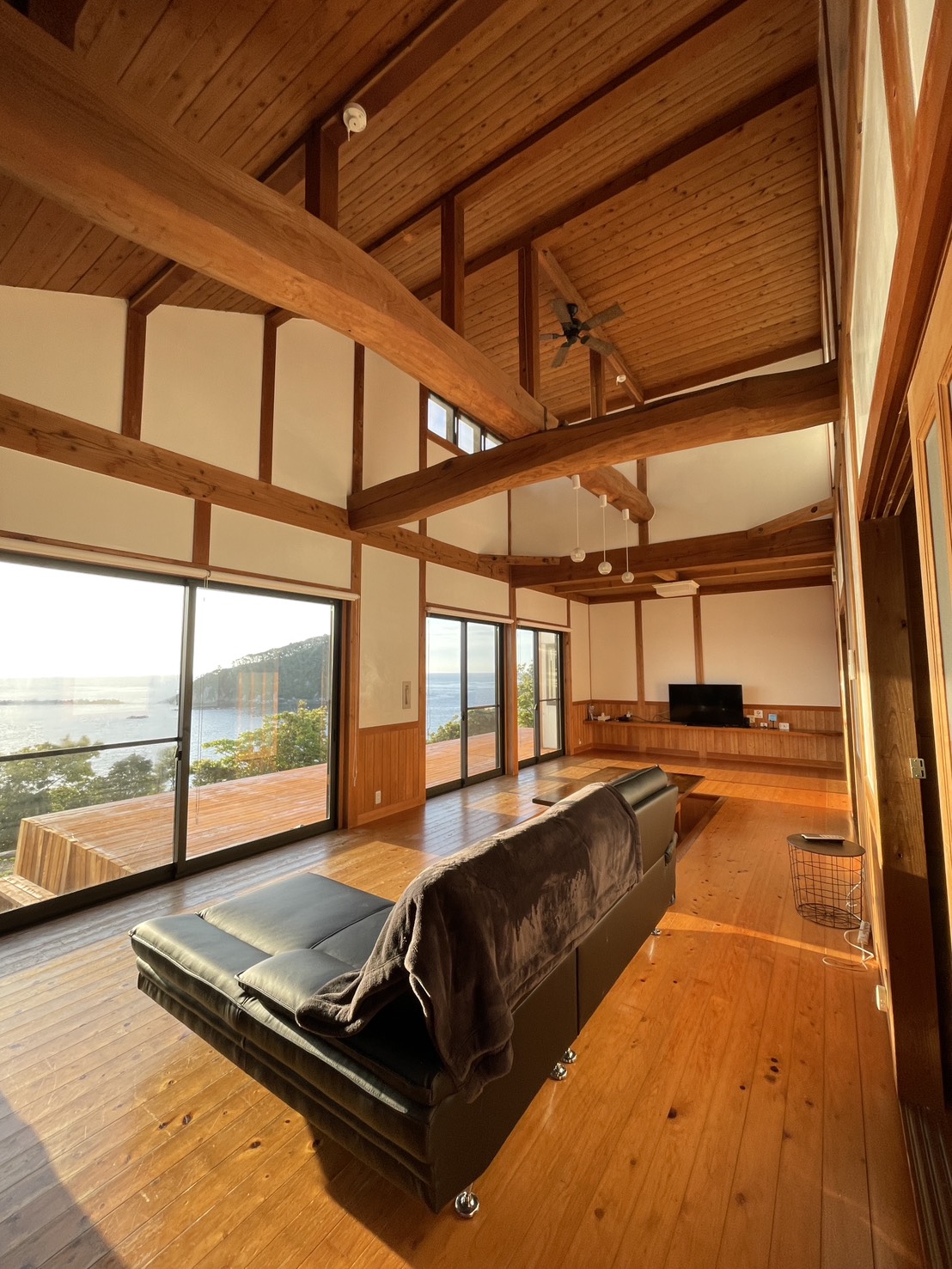玄関を入ると吹き抜けの高い天井、リビングからは海を一望できる大きな窓。